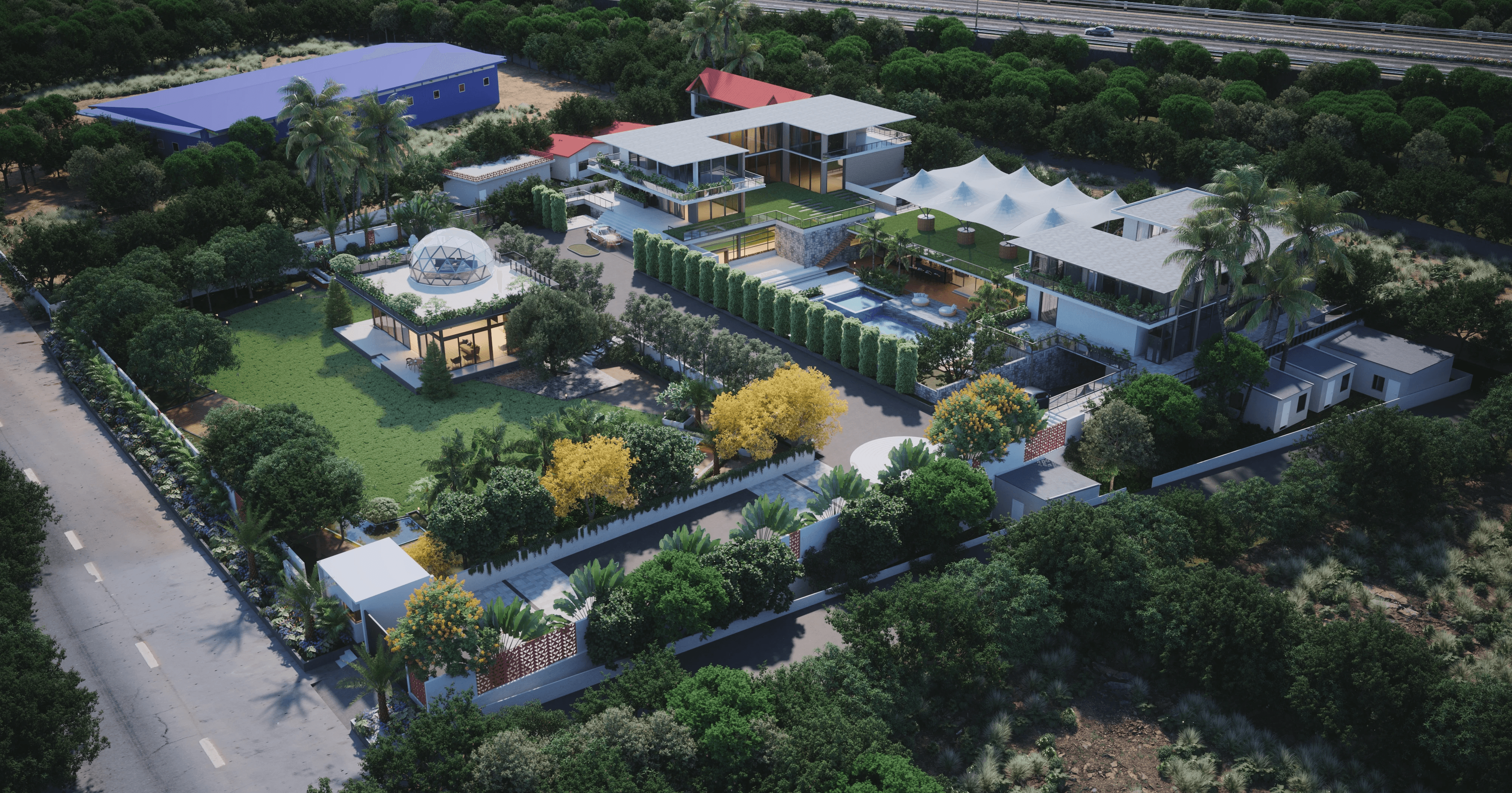 A 2-Acre Luxurious farmhouse designed to sustain all amenities offered by a full-scale society. From personal bowling alley to an olympic size swimming pool, this farmhouse is nothing less than a hotel. Designed by Jodha and the client, this project was bought to life using softwares like 3ds max and autocad.
